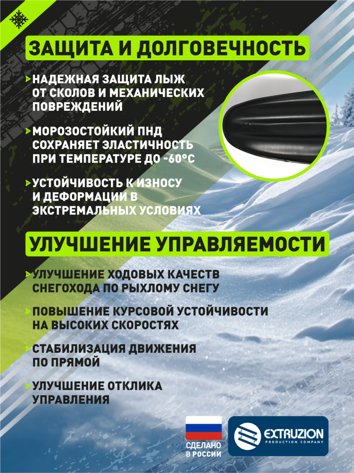 Защита и долговечность. Надежная защита лыж от сколов и механических повреждений Морозостойкий ПНД сохраняет эластичность при температуре до -60C Устойчивость к износу и деформации в экстремальных условиях