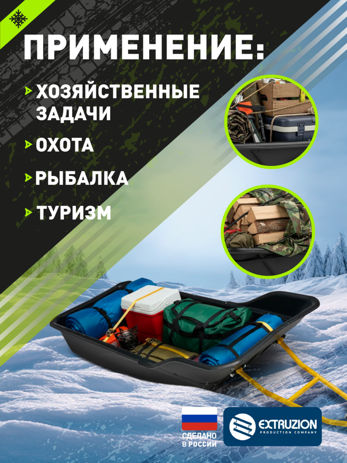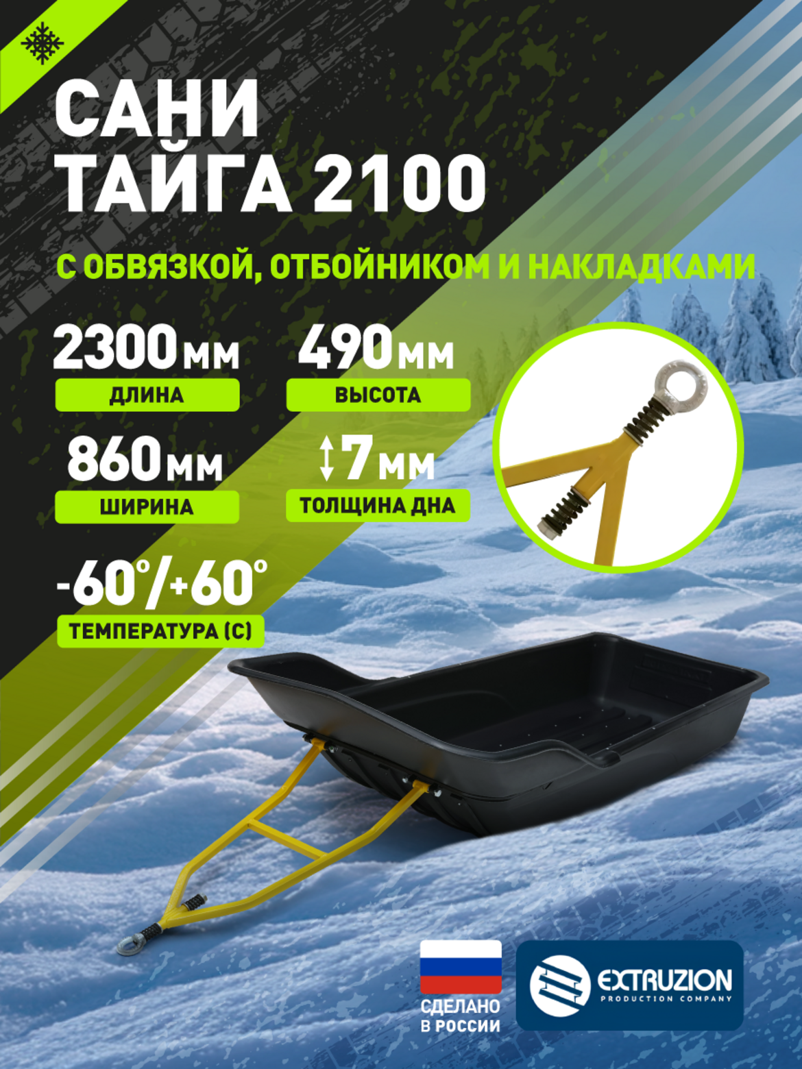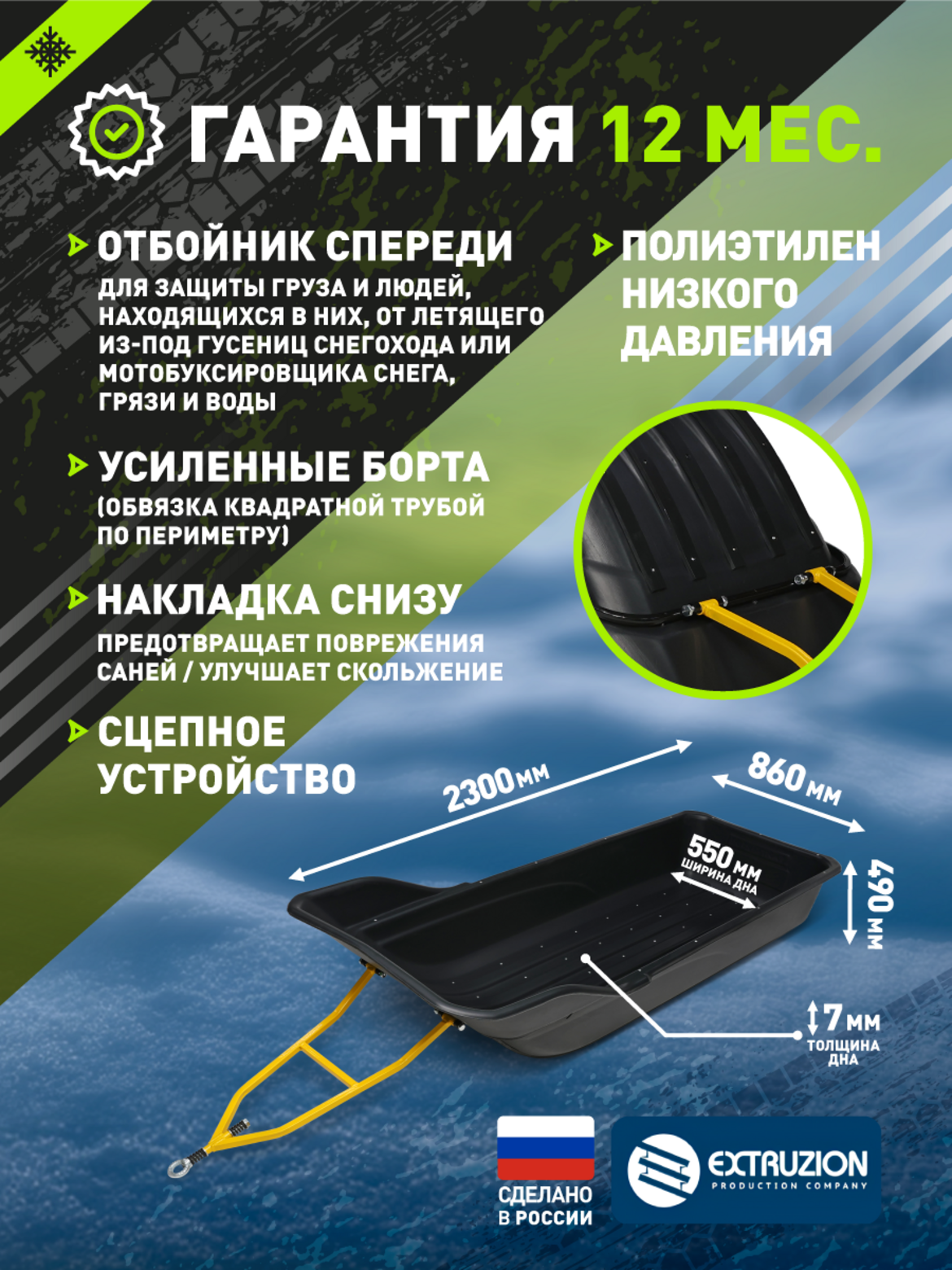 Преимущества конструкции. Узкое дно шириной 550 мм обеспечивает превосходную проходимость по глубокому снегу Сбалансированная геометрия корпуса гарантирует устойчивость на сложном рельефе Увеличенная длина позволяет транспортировать длинномерные предметы