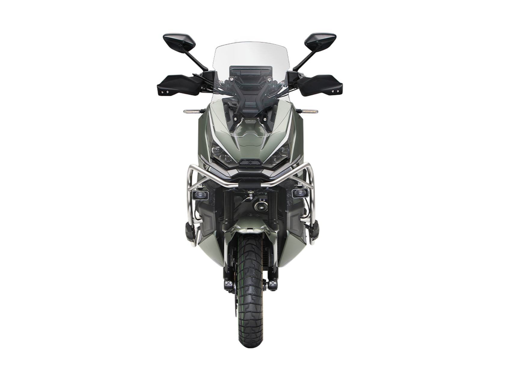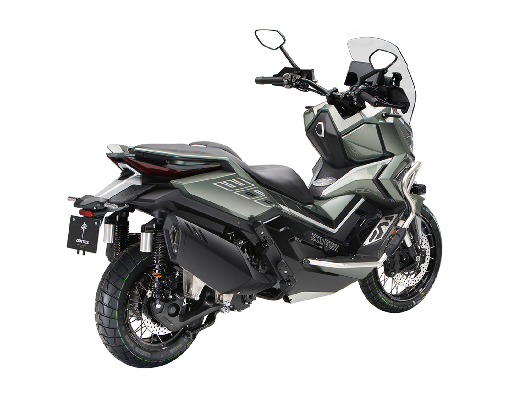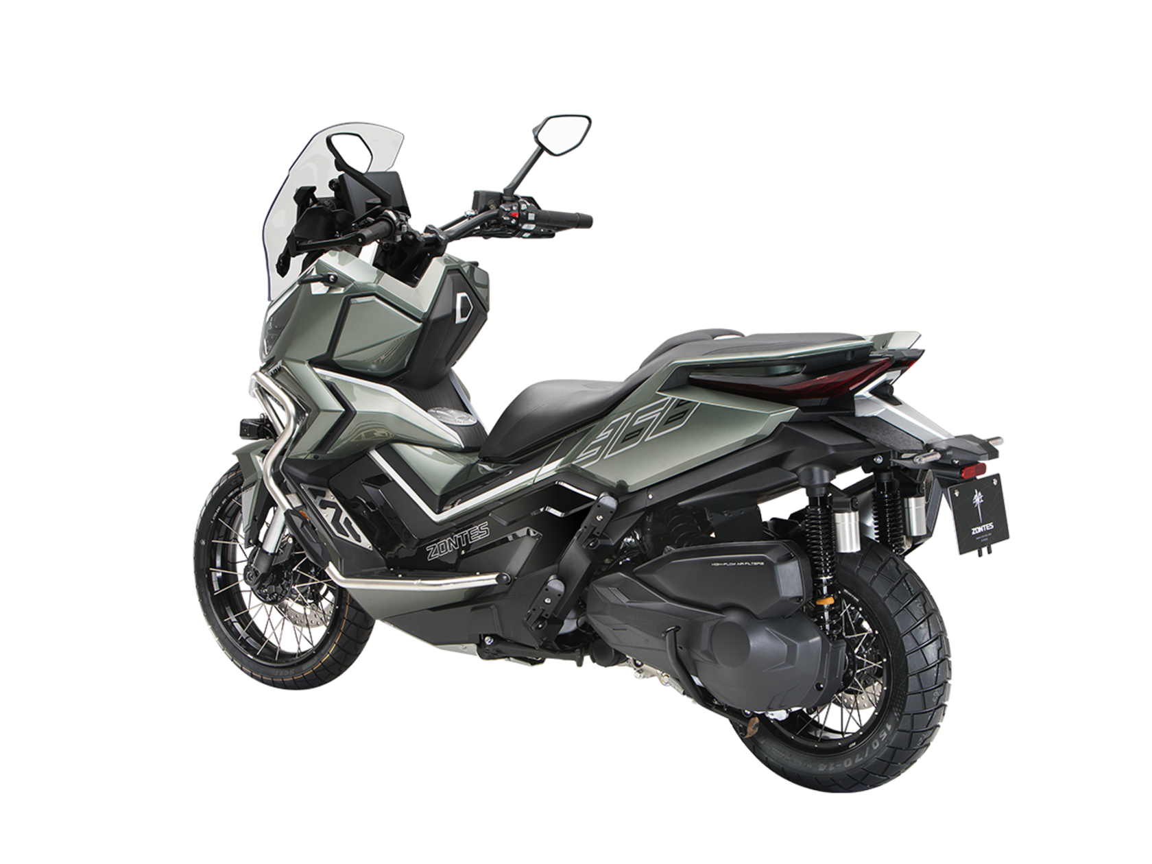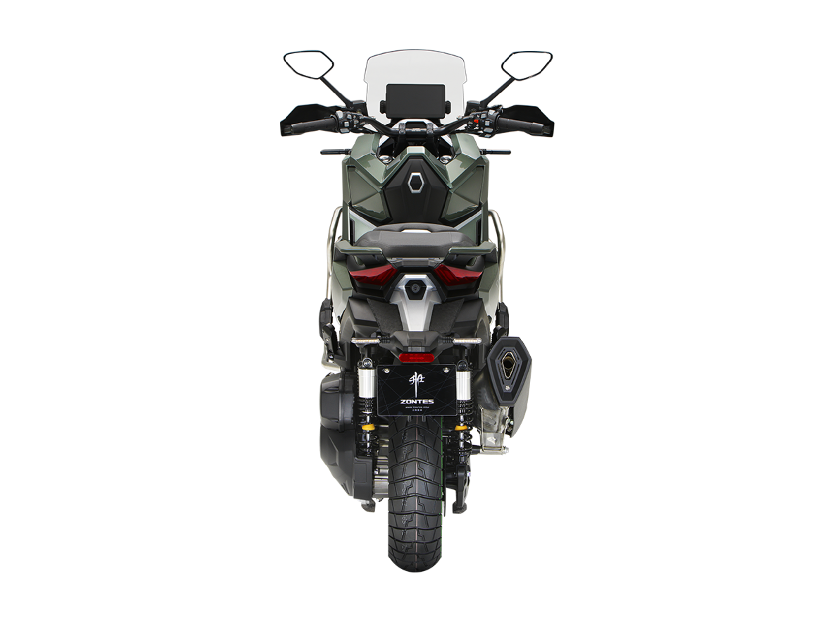 Скутер ZONTES ZT368-G – максискутер двойного назначения, готовый пронестись по улицам города за его пределы и отправиться по грунтовым тропам прокладывать свой маршрут туда, куда вам потребуется. Регулируемая подвеска с перевёрнутой телескопической вилкой спереди обеспечит отличную управляемость и устойчивость в любых условиях.Силовая установка представлена одноцилиндровым 4-тактным двигателем. Двигатель имеет объём 368 см³ и обеспечивает мощность в 38,8 л.с. Оснащён инжектором BOSCH, системой жидкостного охлаждения и вариатором. Запуск двигателя осуществляется с помощью бесключевого доступа.Ёмкость топливного бака 17,5 литра.Колёса имеют диаметр 17 дюймов спереди и 14 дюймов сзади. Для подвески спереди используется телескопическая вилка перевёрнутого типа, а сзади установлены 2 гидравлических амортизатора. Гидравлические дисковые тормоза произведены компанией J.JUAN, входящей в холдинг BREMBO. Мотоцикл также оснащён 2-канальной ABS-системой, противобуксовочной системой TCS System и датчиками давления в шинах.ZT350-G оборудован яркой LED-фарой, мультимедийной приборной панелью с TFT-дисплеем, имеются 2 USB-порта.Габариты скутера 2230х925х1290 мм. Колёсная база 1560 мм. Высота по седлу 795 мм. Вес 198 кг.