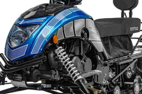 Снегоход Sharmax SN-280 Pro – Самая легкая модель линейки Sharmax Snow. Снегоход укомплектован усовершенствованным, четырехтактным, одноцилиндровым мотором рабочим объёмом 149 см3. Японский карбюратор Mikuni с подогревом, позволяет запустить снегоход при температуре до -40 градусов. Доработанная система газораспределения и облегченный поршень позволили добиться мощности в 13 лошадиных сил! Вариатор “MALLOSI”, позволит разогнать снегоход до каких-то невероятных для данного класса 50 км/ч.В основе SN-280 Pro модульная платформа. Каждый элемент рамы вырезается по отдельности на лазерном станке, что позволяет создать надежный и крепкий каркас машины. Такая рама прослужит долгие годы и не подведет райдера. Длинная и в меру широкая резинотканевая гусеница с повышенным грунтозацепом создает большое пятно соприкосновения с поверхностью и в разы увеличивает проходимость снегохода. Совокупность этих факторов позволяет без риска перевозить двоих пассажиров и груз до 170 кг. под наклоном до 35 градусов. Сзади есть мощный фаркоп с возможность транспортировать до 300 килограммов груза.  Передняя подвеска – независимая с двойными А-образными рычагами, задняя – склизовая, с маятниками и газомасляными амортизаторами. Гидравлическая тормозная система. Подогрев ручек и курка, спинка для пассажира, яркая фара, чека безопасности, интуитивная приборная панель и аэродинамическое ветровое стекло — всё, что нужно для комфорта райдера собрано в снегоходах Sharmax.