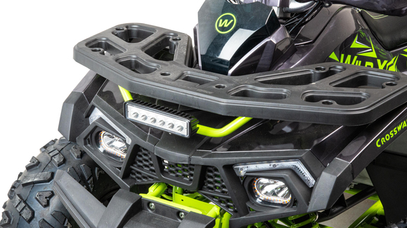 Motoland 125 WILD X PRO – входит в линейку современных и универсальных квадроциклов. Его утилитарный дизайн разработан с учетом вкусов современного поколения и понравится всем без исключения. Его 8 –дюймовые колеса на литых дисках с хорошей внедорожной резиной с легкостью преодолеют все преграды в виде грязи, песка, луж и кочек. У этого квадроцикла отличная управляемость в любых условиях эксплуатации, благодаря грамотной настройке подвески. Данная модель оснащена новинкой, отдельным подрамником на сайлентблоках под ДВС а так же на двигателе установлен балансирный вал , что обеспечивает максимально комфортную езду. Усиленная 428 цепь Максимальная скорость у Motoland 125 WILD X PRO 125 кубов – 60 км/ч. Объем топливного бака составляет 3,5 л. Также помимо основной светодиодной оптики, на данном квадроцикле спереди установлена дополнительная светодиодная фара, подворотники, зеркала заднего вида, защита рук, встроенная функция родительского контроля и автоматическая коробка передач D-N-R. с реверсом, которая установлен на усиленной раме, что дает уверенность в прочности конструкции. Любой быстро овладеет навыками езды на данной технике и получит массу запоминающихся эмоций.
