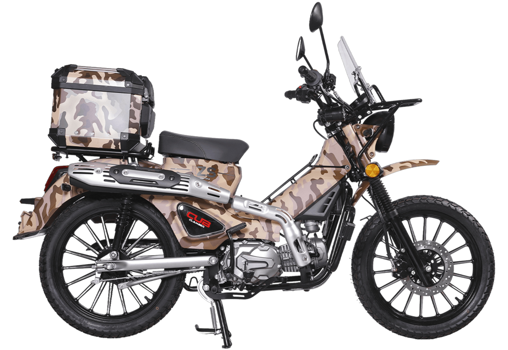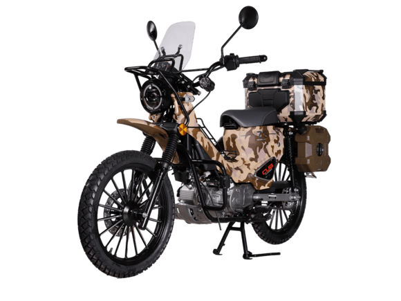 ATAKI Yemi Hunter – стильный мопед для настоящих охотников и рыбаков. Юркая модель с камуфляжным принтом и объёмными кофрами, готовая отправиться на лесные тропы.Силовая установка представлена одноцилиндровым 4-тактным двигателем с воздушным охлаждением. При объёме 120 см³ двигатель способен обеспечить мощность в 8,8 л.с. Бесперебойную работу в любых условиях обеспечивает карбюраторная система подачи топлива. Запуск двигателя осуществляется с помощью электростартера или кикстартера. Полуавтоматическая коробка передач имеет 4 ступени.Максимальная скорость 80 км/ч.Объём топливного бака 4,5 литра.На мопед установлены колёса диаметром 17 дюймов. Передняя подвеска – классическая телескопическая вилка, подвеска сзади – 2 гидравлических амортизатора. На оба колеса установлены гидравлические дисковые тормоза.Вес 102 кг. Колёсная база 1245 мм. Высота по седлу 765 мм.