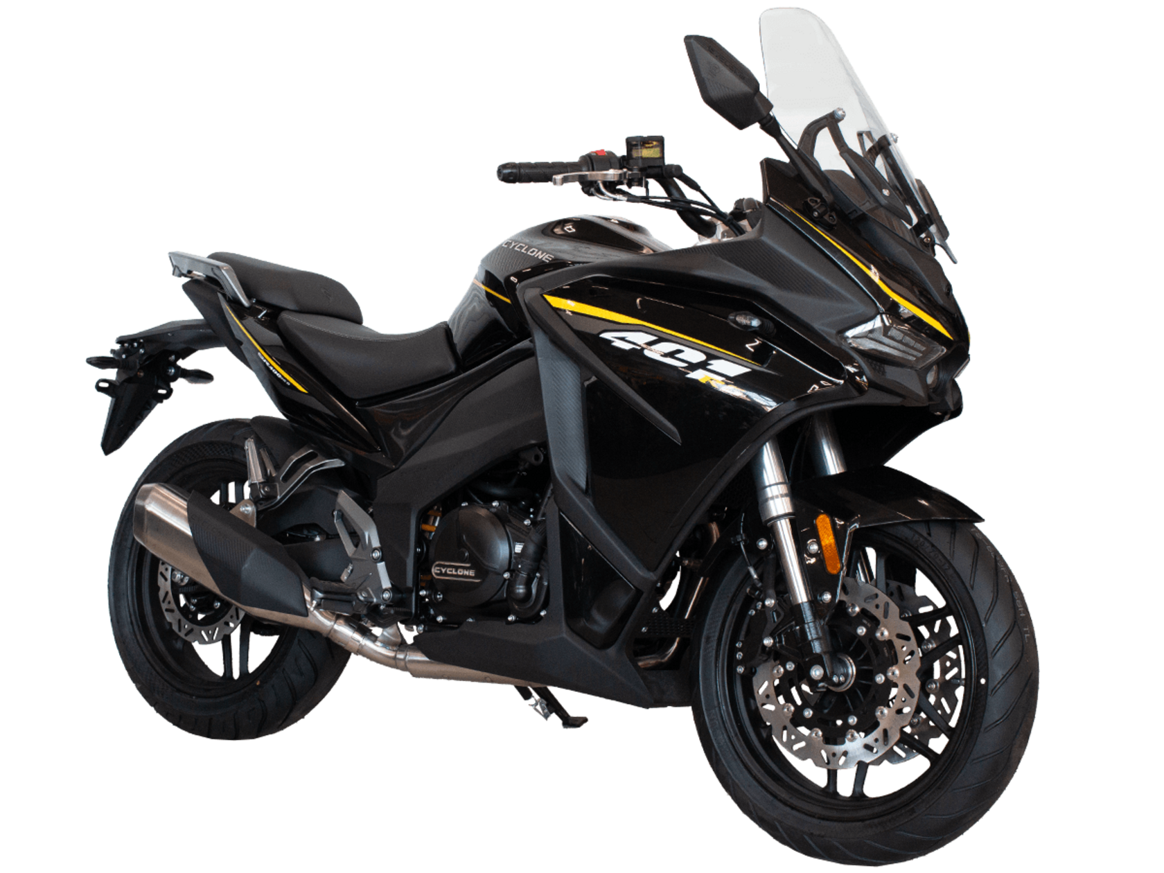 CYCLONE RG401 (SR400GS-B) – турист для покорения самых непростых и протяжённых маршрутов. Он обладает стремительным и современным дизайном в лучших “традициях жанра” туристических мотоциклов.Рядный двухцилиндровый четырёхтактный двигатель объёмом 401 см3 выдаёт 43 л.с. на 9500 об/мин. Максимальный крутящий момент достигается на 8000 об/мин и составляет 37 Н·м. Инжекторный впрыск топлива с блоком управления BOSCH увеличивает топливную экономичность, а также позволяет добиться высокой приёмистости и неприхотливости агрегата. Жидкостная система охлаждения не допустит перегрева двигателя а даже на самых непростых маршрутах. На мотоцикл установлена 6-ступенчатая механическая коробка передач.Максимальная скорость мотоцикла составляет 155 км/ч.RG401 оснащён литыми алюминиевыми дисками диаметром 17 дюймов. Колёса обуты в бескамерные покрышки TIMSUN. С неровностями дороги эффективно справляются телескопическая вилка перевёрнутого типа спереди и маятник с моноамортизатором сзади. Ход передней подвески составляет 120 мм, задней – 55 мм. Оба компонента подвески являются регулируемыми. Эффективное и безопасное замедление с любых скоростей обеспечивают гидравлические дисковые тормоза с двухканальной системой ABS спереди и сзади.Клиренс мотоцикла составляет 155 мм. Объём топливного бака – 21 л. Снаряжённая масса – 213 кг.Модель имеет два видеорегистратора, механическую регулировку ветрового стекла, датчики давления в шинах, подсветку пультов и два USB-порта. При желании можно оснастить мотоцикл двумя боковыми кофрами.Мотоцикл сочетает в себе отличные технические характеристики, комфорт и надёжность, что позволяет вам ощутить настоящую свободу на любой дороге.