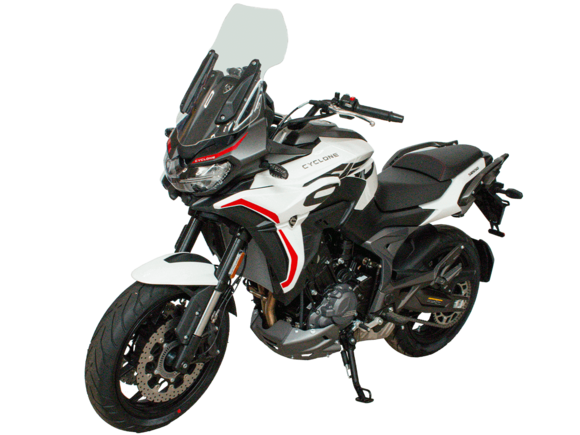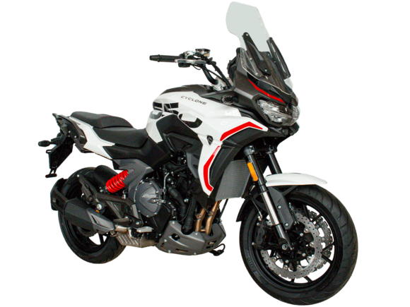 CYCLONE RX6 (SR650) – туристический эндуро для покорения самых непростых и протяжённых маршрутов. Он обладает агрессивным и современным дизайном, который выгодно выделяет его из всех остальных мотоциклов в своём классе. Мотоцикл дарит своему владельцу абсолютную свободу передвижения, позволяя долго и быстро ехать по шоссе, а при желании съезжать на такие дороги, по которым не проедет ни один дорожный мотоцикл. Небольшие габариты этого байка позволяют с успехом использовать его, как повседневный дорожный мотоцикл.Данная модель является самой крупнокубатурной в модельном ряде компании CYCLONE. Рядный двухцилиндровый четырёхтактный двигатель объёмом 650 см3 выдаёт мощность в 71 л.с. на 8500 об/мин. Максимальный крутящий момент достигается на 7000 об/мин и составляет 62 Н·м. Инжекторный впрыск топлива с блоком управления BOSCH увеличивает топливную экономичность, а также позволяет добиться высокой приёмистости и неприхотливости агрегата. Жидкостная система охлаждения не допустит перегрева двигателя даже при самом агрессивном вождении. На мотоцикл установлена 6-ступенчатая механическая коробка передач.Максимальная скорость мотоцикла составляет 180 км/ч.Модель оснащена литыми алюминиевыми дисками диаметром 17 дюймов. Колёса обуты в бескамерные покрышки от легендарной фирмы PIRELLI. С неровностями дороги эффективно справляются компоненты производства культовой японской компании KYB – телескопическая вилка перевёрнутого типа спереди и маятник с моноамортизатором сзади. Ход передней подвески составляет 130 мм, задней – 51 мм. Оба компонента подвески являются регулируемыми. Эффективное и безопасное замедление с любых скоростей обеспечивают гидравлические дисковые тормоза с двухканальной системой ABS спереди и сзади. Тормозные системы произведены известной испанской фирмой J.JUAN (входящей в легендарный холдинг BREMBO).Мотоцикл отличает хорошо продуманная компоновка с высоко расположенным радиатором. Высота 820 мм по седлу позволяет чувствовать себя комфортно даже райдерам небольшого роста. На данной модели установлена металлическая защита выхлопной системы и масляного фильтра. Под пассажирским сиденьем размещён небольшой, но крайне полезный набор инструментов.RX6 (SR650) оснащён бортовым компьютером с информативным цветным дисплеем и кнопками управления на руле, а также двумя штатными видеорегистраторами спереди и сзади. Из других приятных мелочей в допоборудовании мотоцикла стоит выделить регулируемое при помощи кнопки ветровое стекло, датчики давления в шинах, подсветку пультов, бесключевой доступ и 2 USB-порта.Клиренс мотоцикла составляет 165 мм. Объём топливного бака – 20 л. Снаряжённая масса – 245 кг.Мотоцикл сочетает в себе отличные технические характеристики, богатое оснащение, комфорт и надёжность, что позволяет вам ощутить настоящую свободу, отправившись на нём в любое путешествие.