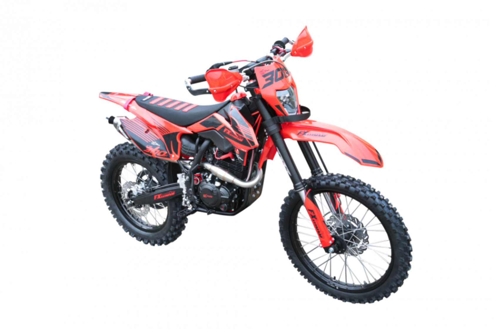FXMOTO YX300 – Мощность и Надежность для Экстремального КроссаFXMOTO YX300 – это универсальный эндуро-байк, разработанный для бездорожья и сложных маршрутов. Оснащенный проверенным 4-тактным двигателем **ZONGSHEN ZS 175FMN** объемом **272 куб. см**, он обеспечивает стабильную мощность и крутящий момент. Воздушное охлаждение делает двигатель надежным и неприхотливым в обслуживании, а **5-ступенчатая коробка передач** и **электростартер с кикстартером** гарантируют удобство эксплуатации.Полностью **регулируемая передняя вилка перевернутого типа (900 мм, 51/54 Ф41 MNT)** и **задний амортизатор с выносным бачком (460 мм MNT)** обеспечивают отличную управляемость и комфорт на любых покрытиях.Мотоцикл комплектуется **легкими алюминиевыми ободами (21" перед, 18" зад) и усиленными спицами (3,95 мм/4 мм)**, что делает колеса максимально прочными. Стальная маятниковая подвеска, прочные ступицы **gravity cast hub** и литые траверсы гарантируют надежность конструкции даже в экстремальных условиях.Для улучшенной проходимости байк оснащен **усиленной цепью CHOHO 520**, спортивным карбюратором **NIBBI PE30 Black**, алюминиевым рулем **Т6061** и **короткоходной ручкой газа NIIBI**. Антибуксаторы, защита крышек двигателя, защита рук и прочные армированные тормозные шланги обеспечивают дополнительную безопасность.Мотоцикл оснащен современным **светодиодным освещением (фара 5 диодов + ходовые огни), цифровым счетчиком моточасов**, а также прочным **рифленым антискользящим сиденьем** для комфортной езды.