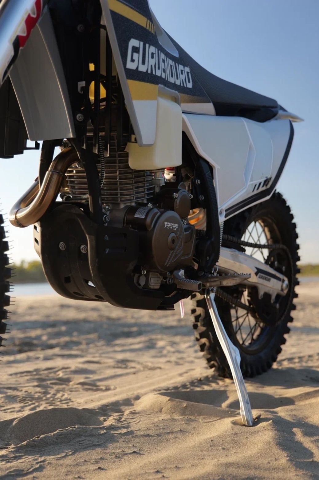 Мотоцикл GURUENDURO AIR300PRO — это современный хард-эндуро байк, созданный для райдеров, которые ценят маневренность, надёжность и динамику на любых трассах. Он идеально подходит как для внедорожных приключений, так и для активных поездок по пересечённой местности.Сердцем модели является 300-кубовый LC двигатель YB300H с воздушным охлаждением и 4-тактной конструкцией, выдающий 27 лошадиных сил. Электростартер обеспечивает лёгкий запуск, а механическая 6-ступенчатая коробка передач даёт полный контроль над динамикой мотоцикла.Передняя и задняя подвески MNT полностью регулируемые и настроены для максимального комфорта и устойчивости на любых покрытиях. Передняя вилка перевернутого типа с ходом 54–60 мм и задняя с поршнем Ф40 обеспечивают отличное сцепление и смягчение ударов, даже на самых сложных трассах.Модель оснащена современным оборудованием: цифровая приборная панель, LED-фара с пятью линзами, защита двигателя и рук, а также влагозащита ключевых элементов. Колёса GE-racing 21″ спереди и 18″ сзади с широкими покрышками обеспечивают уверенное сцепление и стабильность на любой поверхности.Каждая деталь AIR300PRO продумана до мелочей — от прочной рамы К10 до фирменного пластика Husqvarna 2024 года. Этот мотоцикл сочетает в себе стиль, надёжность и высокую производительность, позволяя райдеру полностью раскрыть потенциал эндуро и наслаждаться свободой на дороге и бездорожье..