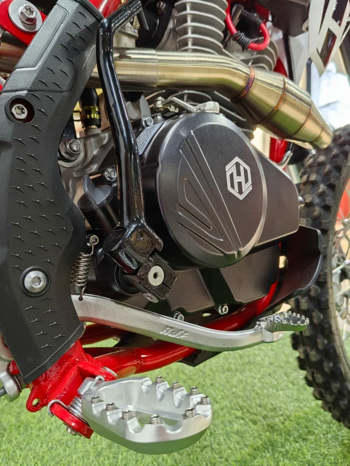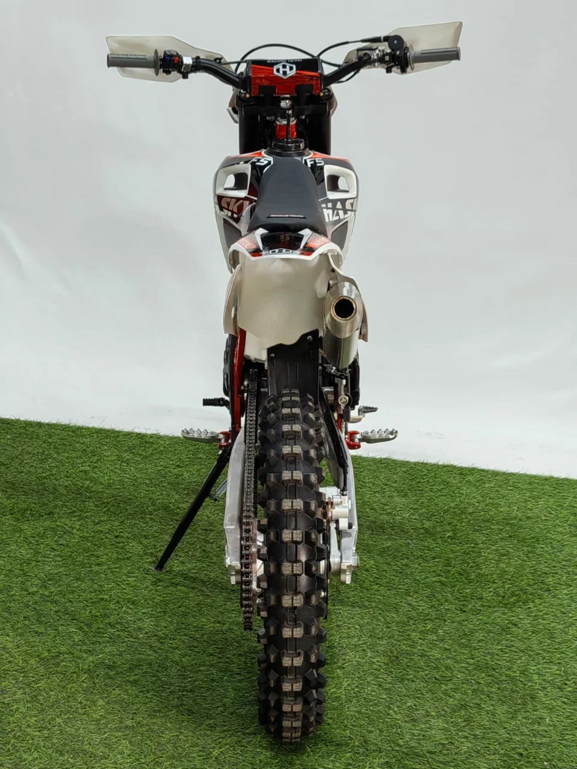 Для истинных ценителей мотоспорта компания Hasky представляет специальную версию своего флагмана – F5 Racing Limited Edition. Этот среднеразмерный эндуро-байк с колесной формулой 21/18 дюймов создан для тех, кто требует от техники максимальной отдачи и надежности в экстремальных условиях.В основе мотоцикла лежит двигатель Loncin 166 YB250R, работающий в паре с 5-ступенчатой коробкой передач. Спортивный карбюратор Nibbi PE 30 Race обеспечивает мгновенную реакцию на ручку газа, а электростартер гарантирует беспроблемный запуск в любых условиях. Подвеска профессионального уровня включает передние амортизаторы HTW с диаметром пера 43 мм и задний моноамортизатор той же марки, что обеспечивает превосходную управляемость на сложном рельефе.Мотоцикл оснащен усиленными алюминиевыми ободами Unison 7016, покрышками Soft (120/90-18 сзади и 80/100-21 спереди) и специальными камерами с усиленной 3-мм стенкой. Руль из высокопрочного сплава 7075 в сочетании с эргономичными грипсами Lock-on обеспечивает полный контроль над байком. Особого внимания заслуживает система безопасности: влагозащищенная проводка, складной рычаг сцепления на 360, защита рук и мощная светодиодная фара с пятью линзами.