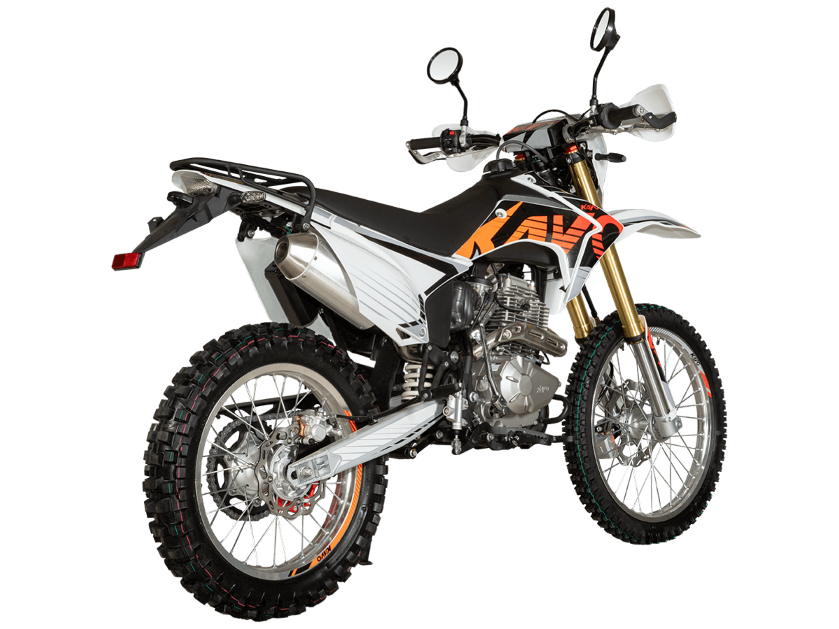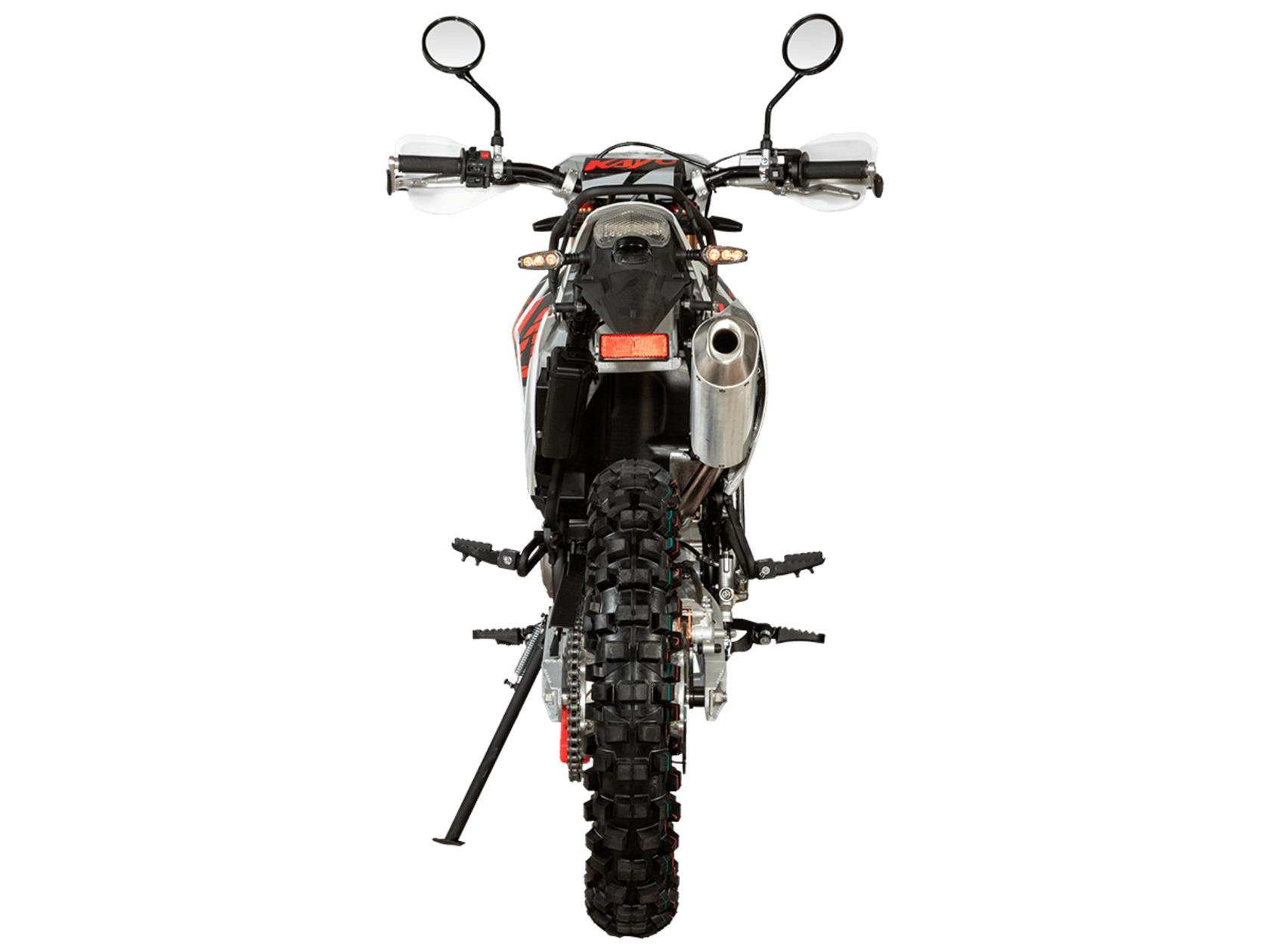 Мотоцикл KAYO T1 300 Enduro 21/18 2025 ПТС – надёжный и производительный эндуро, готовый встретить вызовы внедорожных трасс.Оснащён 4-тактным двигателем объёмом 271 см³ с верхним распредвалом и воздушным типом охлаждения. Максимальная мощность в 24 л.с. развивает при 8500 об/мин, а максимальный крутящий момент 22 Нм при 6500 об/мин. За подачу топлива отвечает карбюратор PD30. Он обеспечивает плавность хода, топливную экономность и бесперебойную работу двигателя даже в самых жёстких условиях. Соотношение диаметра цилиндра и хода поршня 75,0х61,4. Степень сжатия 9,29:1. Запуск двигателя осуществляется с помощью электростартера или кикстартера. Тип зажигания CDI. Снизу установлена пластиковая защита двигателя.Механическая коробка передач имеет 5 ступеней. Привод цепной. Объём топливного бака 9 литров.На мотоцикл установлены спицованные колёса с алюминиевыми ободами, алюминиевыми ступицами и буксаторами. Обуты во внедорожные покрышки YUANXING 80/100-21 и 110/100-18.Длина подвески спереди 880 мм, длина задней подвески 380 мм. Задняя подвеска оснащена прогрессией. Траверсы выполнены из литого алюминия, а прогрессия – из стали. За торможение отвечают дисковые гидравлические тормоза.Прочная рама и маятник выполнены из стали. Мотоцикл имеет ПТС и оснащён всем необходимым для поездок по дорогам общего пользования: диодная светотехника (яркая фара, поворотники, стоп-сигнал), звуковой сигнал, цифровая приборная панель, зеркала заднего вида.Для управления установлен руль переменного сечения 28 мм Fatbar со стандартными рычагами сцепления и тормоза, на который установлена алюминиевая защита рычагов с широкими ветрозащитными щитками. Имеется платформа для перевозки грузов и дополнительные подножки для поездок с пассажиром.Габариты мотоцикла 2100х810х1180 мм, вес 119 кг. Клиренс 340 мм, колёсная база 1420 мм, высота по седлу 900 мм.