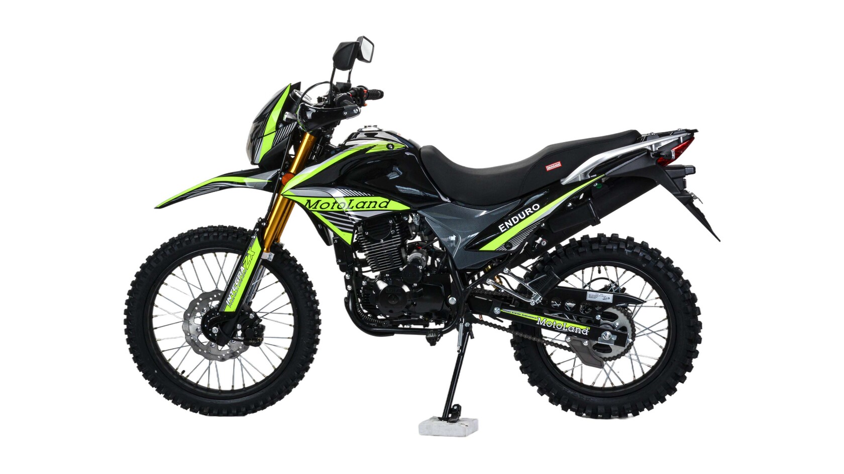 Прочность, мощь и надежность – вот ключевые характеристики кроссового мотоцикла 300 ENDURO ST NEON от бренда MOTOLAND. Этот байк представляет собой идеальное сочетание высоких технологий и безупречного дизайна, созданного для тех, кто стремится преодолевать любые трудности на дороге.Одной из важнейших особенностей этой модели является ее мощный двигатель с рабочим объемом 300 см3 и маркировкой 175 FMN PR5. С мощностью в 25 лошадиных сил и балансирным валом, этот мотоцикл готов преодолевать самые сложные трассы.Что касается трансмиссии, то здесь применена механическая передача с пятью ступенями и цепным ГРМ, что обеспечивает плавное переключение передач и высокую надежность в эксплуатации.Система охлаждения воздушно-масляная, что дает эффективное охлаждение двигателя в самых экстремальных условиях. А при запуске мотоцикла вы сможете воспользоваться как электростартером, так и кикстартером, делая его надежным в любой ситуации.Карбюратор PZ34 и свеча зажигания D8EA гарантируют оптимальную работу двигателя на любых режимах, а использование бензина с октановым числом 92 обеспечивает экономичный расход топлива.Этот мотоцикл оснащен спицованными металлическими колесами размером 90х100 R21 спереди и 110х100 R18 сзади, что обеспечивает отличное сцепление с дорогой и устойчивость на пересеченной местности.Приборная панель выполнена в формате LCD, отображая ярко и четко информацию о состоянии мотоцикла. А линзованная диодная фара и задний стоп-сигнал гарантируют безопасность в ночное время и обозначают ваше присутствие на дороге.