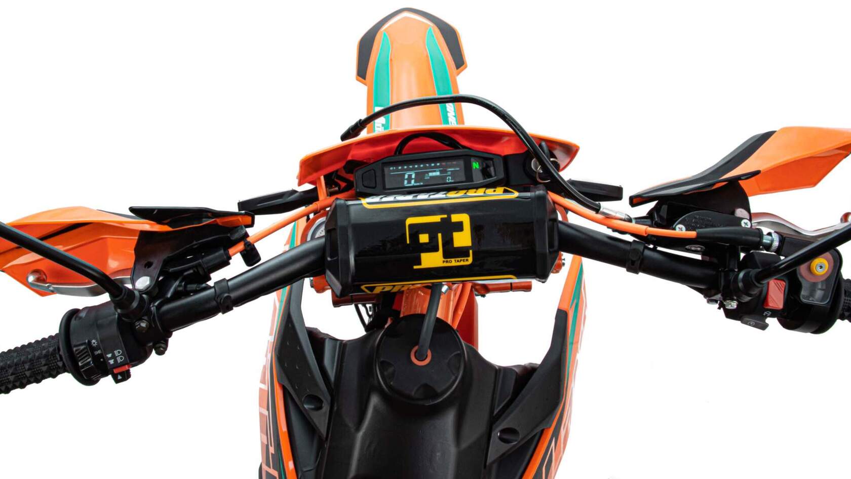 Мотоцикл Кросс SMX300 с ПТС это отличный кроссовый мотоцикл. Имеет хорошую проходимость и тяговую мощность за счет установленного двигателя ZONGSHEN 175FMM мощностью 25 л.с. и карбюратора NIBBi 32. Идеален для бездорожья, т.к. его кроссовые шины (120-90) и (80-100) просто созданы для езды по мягкому и среднему грунту. Телескопическая вилка с регулировками перевернутого типа позволяет легко преодолевать ямы, ухабы и другие неровности. Задняя подвеска маятниковая, с моноамортизатором. Его дизайн подчёркивает неуступчивый спортивный характер байка.Мотоцикл Кросс SMX300, выдерживает нагрузку до 150 кг. Прочный облицовочный пластик типа КТМ 2024 года. Надёжно закрепленный руль имеет переменное сечение: 28 мм в месте крепления и 22 мм на концах под грипсами, а также короткоходную ручку газа. На мотоцикле установлена защита рук и подножки для пассажира. Колёса алюминиевые, оснащены усиленными спицами и антибуксаторами, размер переднего — 21 дюйм (80-100), заднего — 18 дюймов (120-90), тормозная система – с одно и двухпоршневыми тормозными суппортами соответственно.Для запуска двигателя можно использовать электростартер или кикстартер. Система зажигания электронная (CDI). Механическая трансмиссия содержит 5 передач. У мотокросса отличный запас хода: - 9 л, расход топлива - 5 л на 100 км. Передняя LED фара обновленного дизайна легко включается поворотом замка зажигания и позволяет ездить в сумерках и темноте, а также стоит эргономичная и многофункциональная приборная панель.