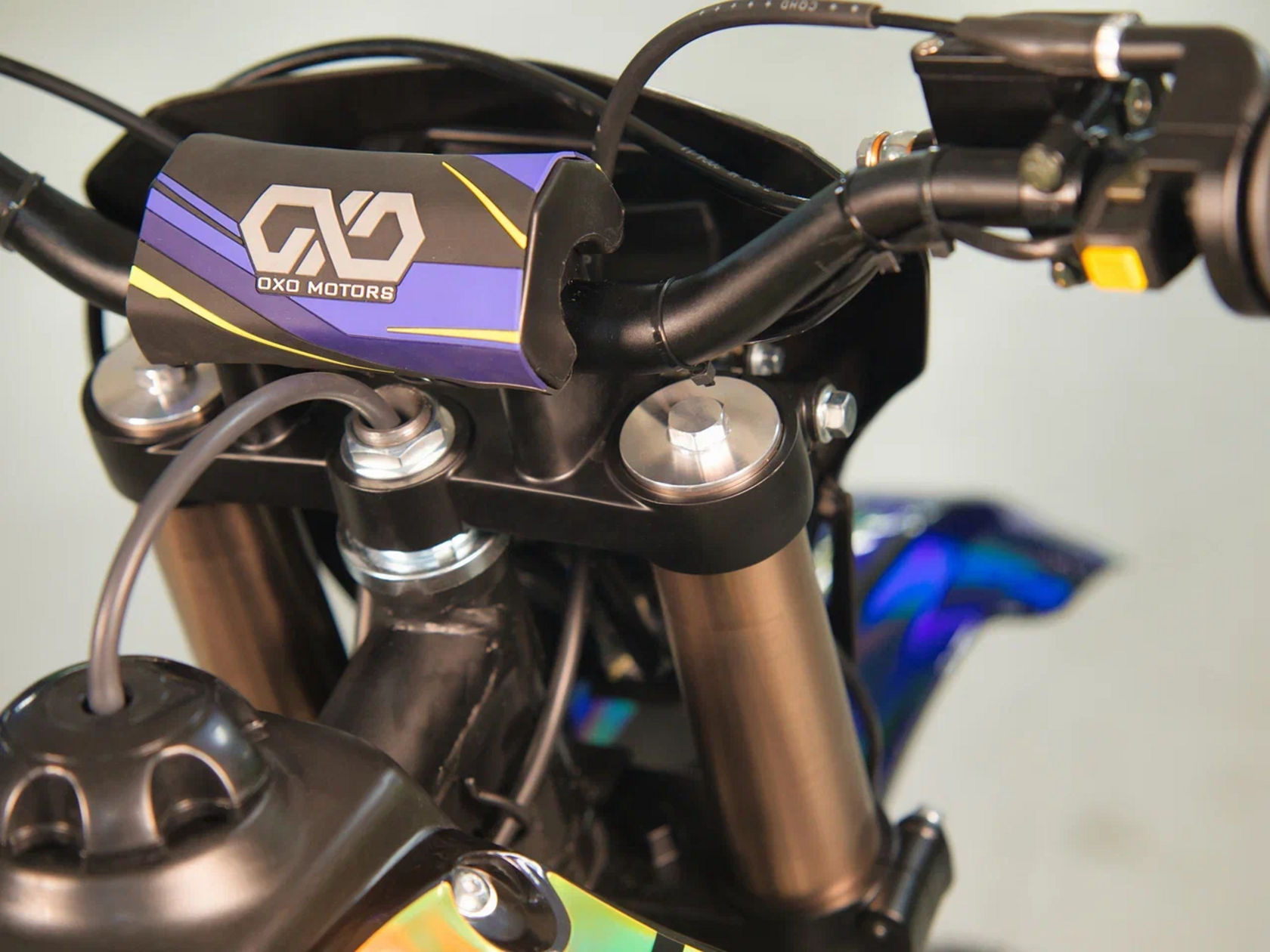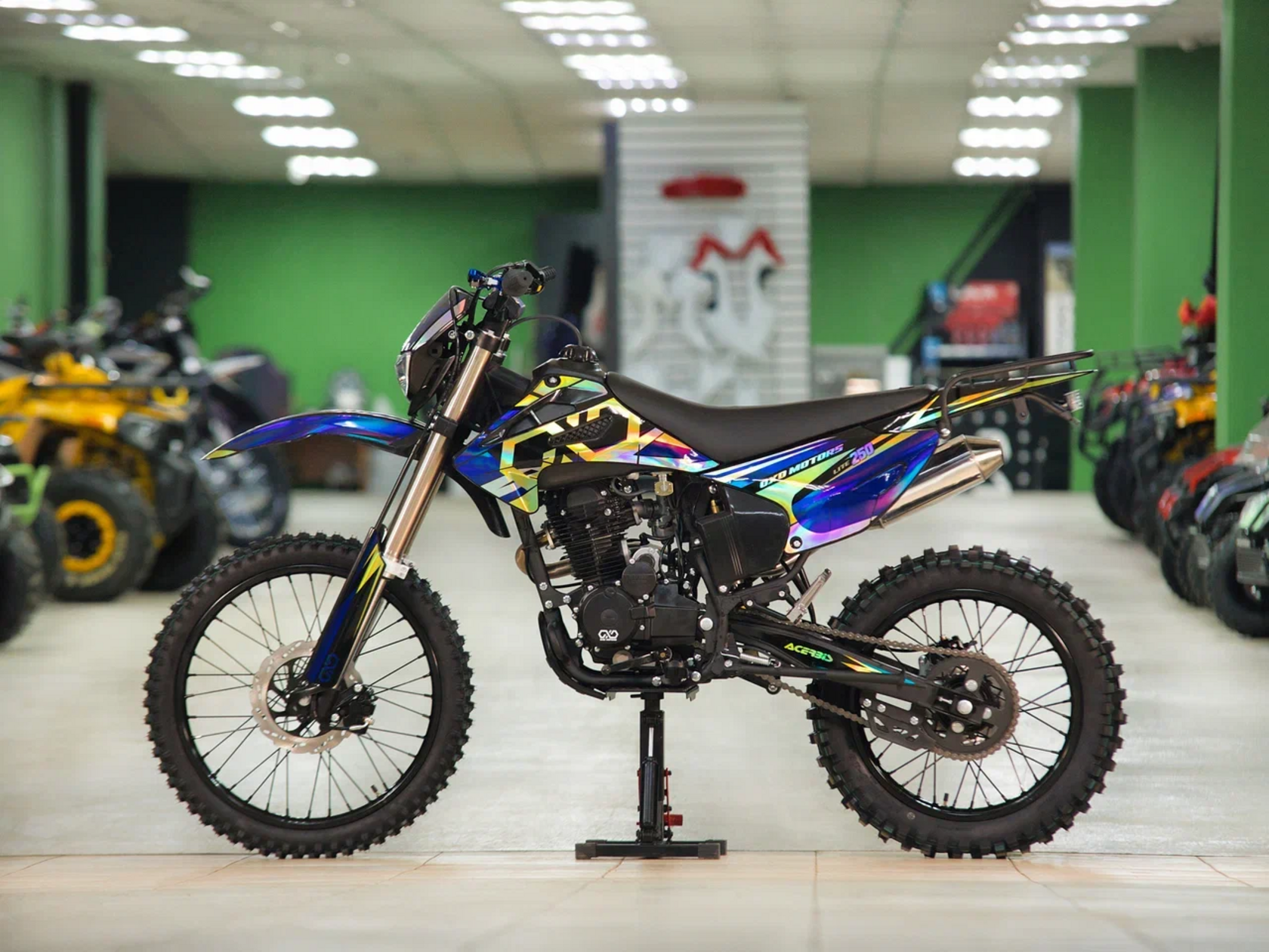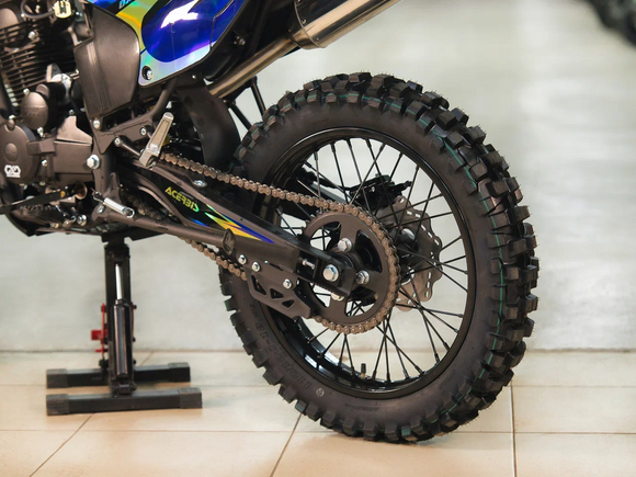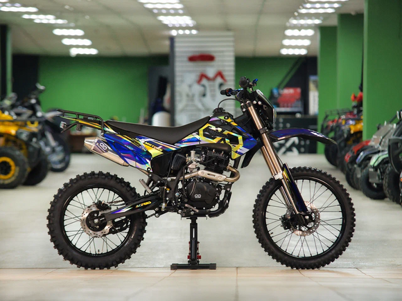 ДвигательДвигатель ZS165FMM - 4-тактный двигатель воздушного охлаждения объёмом 223 куб см с двумя клапанами, оснащён балансировочным валом, благодаря которому уменьшается избыточная вибрация, передаваемая от двигателя на раму и общую конструкцию техники. Характеризуется хорошей тягой с самых низов и лёгким пуском с помощью электростартера. Двигатель отлично зарекомендовал себя в качестве надёжного, универсального, неприхотливого мотора с хорошими характеристиками.РамаРама мотоцикла OXO производится из труб шестигранного сечения хром-молибденовой стали, которая является очень прочной и легкой. Геометрия рамы, благодаря правильно выверенному центру тяжести и углу наклона вилки - способствует наилучшей управляемости устойчивости мотоцикла на низкой скорости.ПодвескаПередняя вилка перевернутого типа. Мотоцикл снабжен моноамортизатором, который соединен посредством системы рычагов прогрессии. Система прогрессии, обеспечивает равномерную, мягкую работу и увеличивает длину рабочего хода подвески.КолесаРазмер передней покрышки: 80/100-21. Размер задней покрышки: 120/100-18. Они прекрасно себя ведут по песку и грязи, что позволяет райдеру отлично показать себя на пересеченной местности.Тормозная системаТормозная система мотоцикла - полностью гидравлическая с армированными шлангами. Спереди и сзади установлен двухпоршневой суппорт. Данная конфигурация тормозных механизмов, позволит быстро и безопасно остановиться с максимальной скорости даже на бездорожье.РульВажная часть современного эндуро мотоцикла - усиленный руль переменного сечения. На руле установлен рычаг заслонки подсоса. Алюминиевая ручка газа с коротким ходом имеет регулировку троса. Также мотоцикл укомплектован электронной панелью приборов..