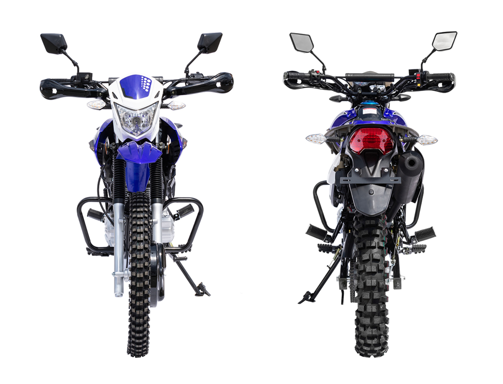 Regulmoto SK 200GY-5 – мотоцикл двойного назначения, созданный для эксплуатации как на дорогах общего пользования, так и на легком бездорожье. Топовая модель линейки лайт-эндуро мототехники известного китайского производителя Senke отличается высокой надежностью повседневной эксплуатации, отсутствием сложностей в сервисном обслуживании, простотой и легкостью управления.В надежной раме с защитными дугами Regulmoto SK 200GY-5 установлен 4-тактный одноцилиндровый двигатель с рабочим объемов в 20 см3, демонстрирующий максимальную мощность в 13.6 л.с. Мотор с воздушным охлаждением, в котором можно без труда признать реплику двигателя известного японского производителя, оснащается балансировочным валом, что позволяет избавиться от излишней вибрации.Подвеска мотоцикла на колесах 21/18 дюймов со стальными ободьями представлена телескопической вилкой-перевертышем спереди, перья которой закрыты защитой, и стальным маятником с моноамортизатором сзади. Тормоза у мотоцикла дисковые, спереди установлен 4-поршневой суппорт, сзади – 2-поршневой.Оснащение Regulmoto SK 200GY-5 соответствует возлагаемым на мотоцикл эксплуатационным задачам: на байке вполне комфортно передвигаться по дорогам и легкому бездорожью, чему способствуют достаточно большой ход амортизаторов, защита цепи, пластиковая защита рук. Среди установленного оборудования присутствуют: аналоговая приборная панель, замок зажигания с защитой от попадания песка и пыли, полный комплект светового оборудования с дополнительными светодиодными поворотниками, встроенными в боковые обтекатели, зеркала заднего вида, стояночная и центральная подножки.Данная модель мотоцикла присутствует на отечественном рынке мототехники уже достаточно длительное время, за которое мотоцикл зарекомендовал себя легким в эксплуатации и неприхотливым в обслуживании аппаратом. О высокой надежности мотоцикла говорят солидный километраж пробегов при отсутствии серьезных неисправностей и позитивные отзывы обладателей Regulmoto SK 200GY-5.У нас Вы можете купить этот мотоцикл с бесплатной доставкой по РФ и гарантией до года. Также его можно приобрести в рассрочку или в кредит.