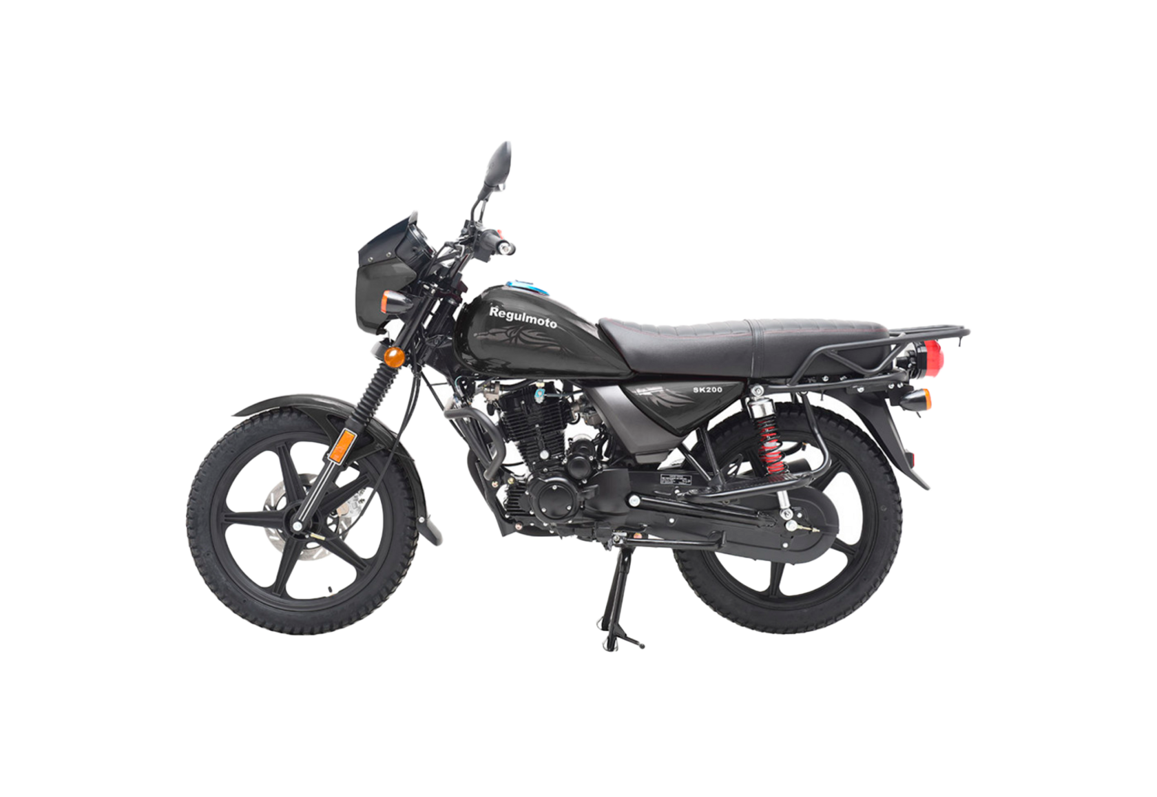 Несмотря на «классический» вид Regulmoto SK200, в комплектации мотоцикла используются современные стильные литые диски колес, световое оборудование на экономичных и долговечных светодиодах, электронное зажигание, ротор дискового тормоза на переднем колесе. Байк полностью готов к эксплуатации на ДОПах: кроме комплекта светотехники и удобной приборной панели, на руле мотоцикла также установлены зеркала заднего вида.