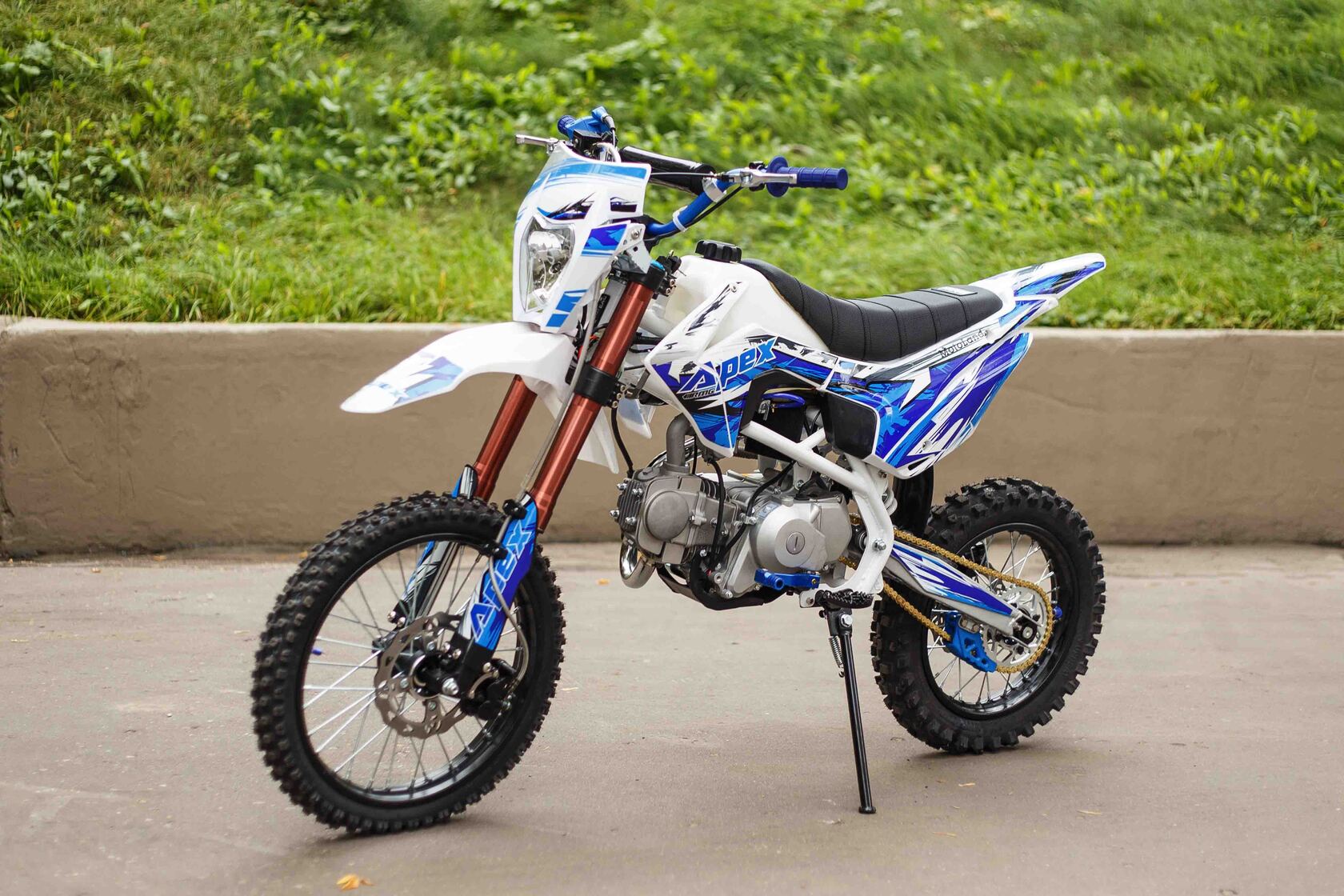 О надёжный питбайк APEX125 идеален для поездок по грунтовым дорогам и бездорожью. Хорошо чувствует себя на мягком и среднем грунте, разгоняется до 90 км/ч. Оснащён CNC траверсами, фарой, алюминиевыми ободами, весит всего 90 кг. Питбайк прост в управлении и не требует специального ухода, подойдёт как новичкам, так и любителям мотокросса.У кроссового мотоцикла APEX125 отличный узнаваемый дизайн. Конструкция подчёркивает неуступчивый спортивный характер питбайка, который не остановится ни перед одним препятствием. Пластик комбинированный, прочный, не ломается при сгибании. Кроссовый мотоцикл APEX125 доступен в красном и синем цвете, при этом в основной цвет окрашен не только пластик, но и обода колёс и другие детали питбайка.Передняя подвеска — телескопическая нерегулируемая вилка перевёрнутого типа, которая отлично подходит для преодоления ям, ухабов и других неровностей плохих дорог или их отсутствия. Задняя подвеска маятниковая с моноамортизатором. Руль 22 мм с высоким подъёмом и перекладиной удобен для мотоциклистов разного роста. Ручки руля — комфортные PRO TAPER. Питбайк оснащён складными рычагами сцепления и переднего тормоза, а также CNC-лапкой переключения передач.Питбайк весит всего 75 кг, при этом выдерживает вес до 150 кг. Оснащён CNC траверсами, рама полудуплексная стальная, мотоцепь качественная. Колёса спицованные, сделаны из прочного и лёгкого алюминия. Размер заднего колеса — 14 дюймов (350 мм), переднего — 17 дюйм (430 мм). Тормоза дисковые, передний тормозной суппорт двухпоршневой, задний — однопоршневой.Питбайк оснащён карбюратором с фильтром нулевого сопротивления VM22 MIKUNI и одноцилиндровым четырёхтактным двигателем с воздушным охлаждением. Надёжный мотор мощностью 9 л. с. и объемом 125 см³ разгоняет кроссовый мотоцикл APEX125 до 90 км/ч. Коробка передач механическая, четырёхступенчатая. Система зажигания электронная (CDI), для запуска двигателя можно использовать кикстартер и электростартер.СверхпроходимостьПокрышки с шипами и высоким грунтозацепом идеальны для бездорожья. Мощность мотора и небольшой вес питбайка позволяют ему преодолевать значительные препятствия и непролазную грязь, хорошо заходить в подъёмы.Для поездок при низкой видимости и в ночное время суток питбайк оснащён фарой, которая включается при повороте замка зажигания (1 – выключить, 2 – включить, 3 – свет). Также в комплекте есть щиток для номера, который ставится вместо фары.Питбайк 125 относится к недорогим моделям, которые при должной эксплуатации работают без сбоев и капризов. Кросс неприхотлив в обслуживании, не занимает много места в гараже. При необходимости в нём легко сменить любую повреждённую деталь. Купить питбайк 125 вы можете в официальном магазине Мотолэнд, здесь же всегда можно приобрести запасные детали и комплектующие, которые стоят недорого и всегда есть в продаже. При покупке питбайка не забудьте о защитной экипировке.