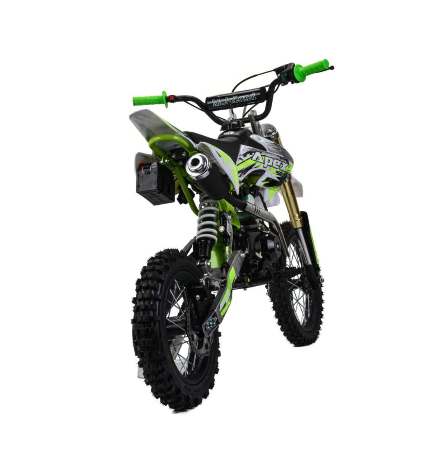 Недорогой надёжный питбайк APEX10 идеален для поездок по грунтовым дорогам и бездорожью для детей которые уже научились ездить на маленьких мотоциклах объемом 50 куб.см. Хорошо чувствует себя на мягком и среднем грунте.Питбайк прост в управлении и не требует специального ухода, подойдёт детям до 13 лет.У питбайка APEX10 отличный узнаваемый дизайн. Конструкция подчёркивает неуступчивый спортивный характер питбайка, который не остановится ни перед одним препятствием. Пластик комбинированный, прочный, не ломается при сгибании.Передняя подвеска — телескопическая нерегулируемая вилка перевёрнутого типа, которая отлично подходит для преодоления ям, ухабов и других неровностей плохих дорог или их отсутствия. Задняя подвеска маятниковая с моноамортизатором. Руль 22 мм с высоким подъёмом и перекладиной удобен для мотоциклистов разного роста.Питбайк весит всего 65 кг, при этом выдерживает вес до 75 кг. Оснащён CNC траверсами, рама полудуплексная стальная, мотоцепь качественная. Колёса спицованные